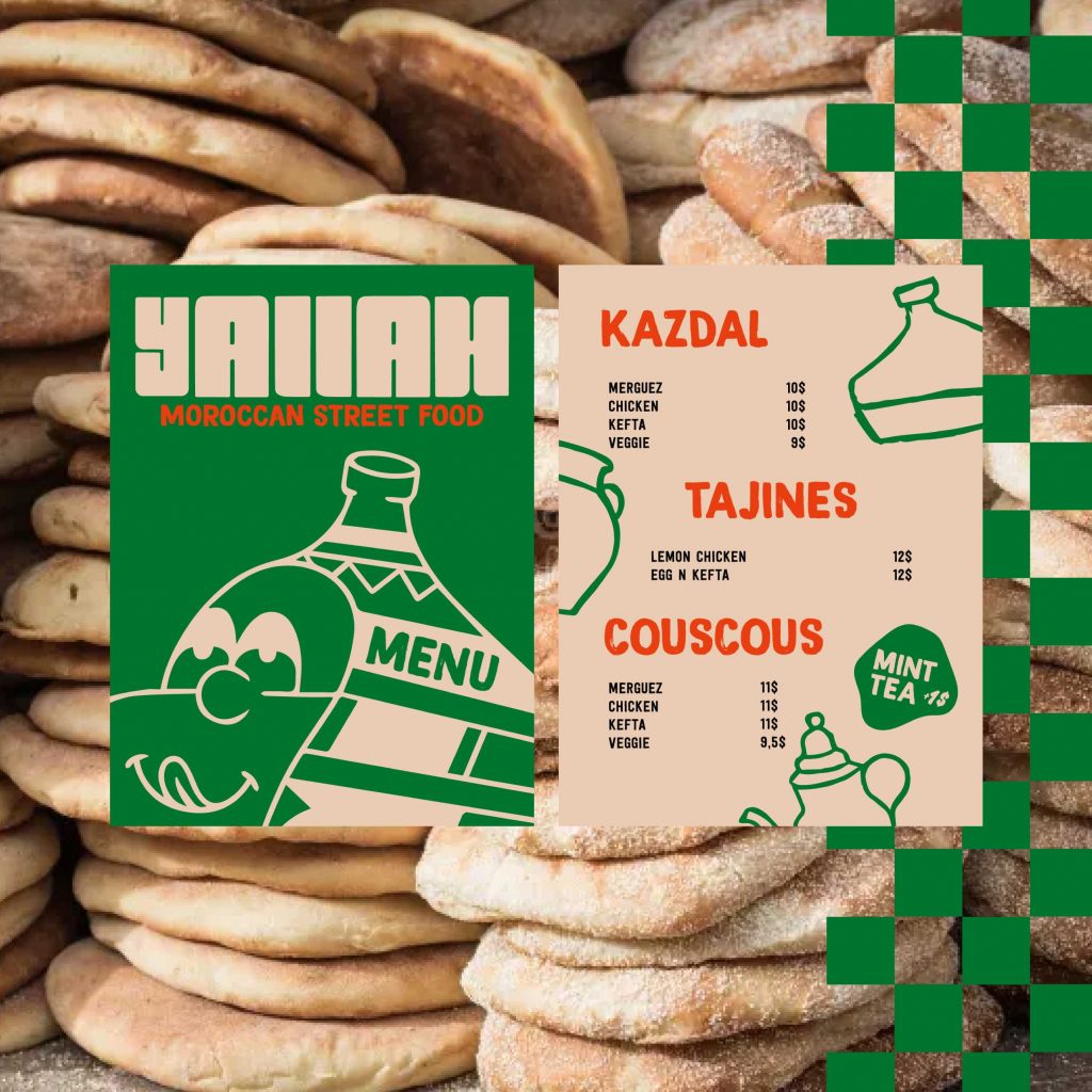 YALLAH est un restaurant de street food marocaine qui met à l’honneur les saveurs authentiques et généreuses du Maroc dans une ambiance moderne et conviviale. L’identité visuelle repose sur un logo au style bold, fort et affirmé, accompagné d’une direction artistique qui puise dans les couleurs emblématiques du Maroc : le vert et le rouge.
